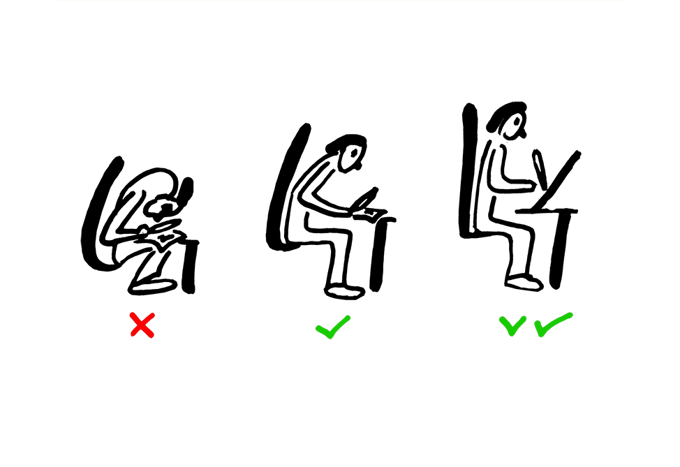 Setze dich gerade und locker hin. Es ist gut, wenn dein Körper nach allen Seiten Bewegungsfreiheit hat. Am allerbesten ist natürlich, wenn du deine Schreibunterlage anklappen kannst: