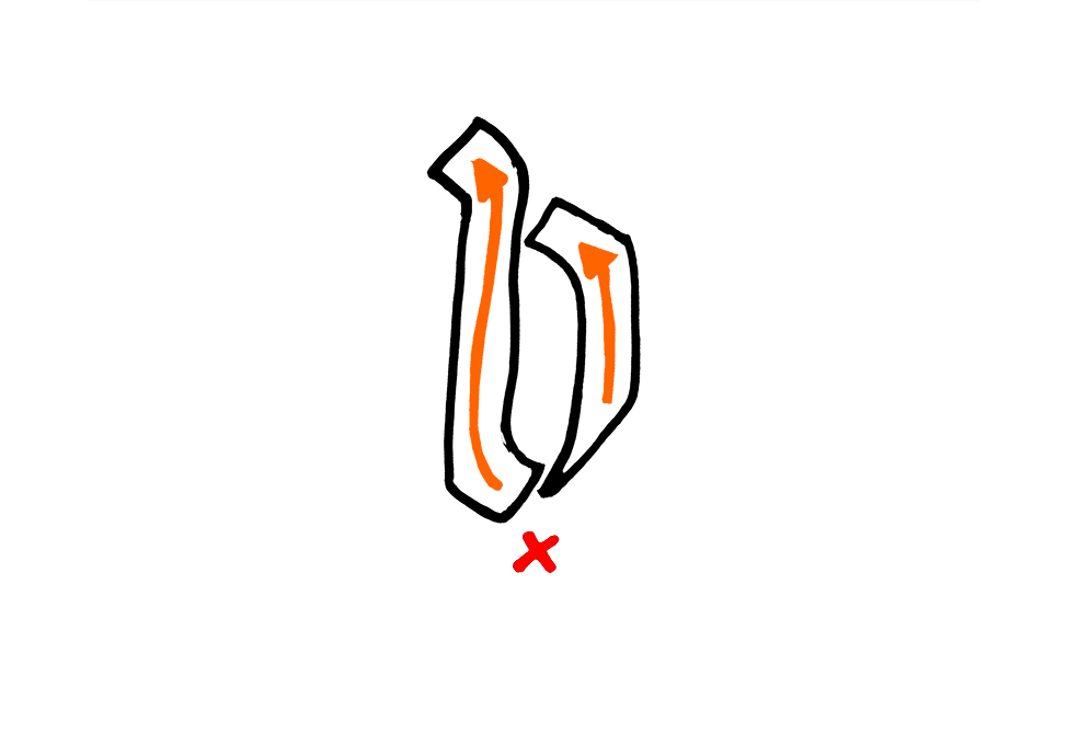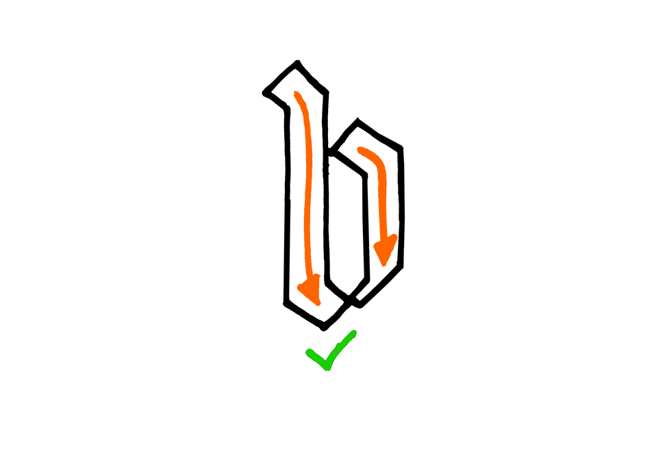 Eine Haltung der Feder von 45 Grad ist gut. Du wirst merken, dass einige deiner Buchstaben gut mit der Breitfeder funktionieren und manche nicht. Das ist in Ordnung. Am besten funktionieren meist Formen, die relativ einfach gehalten sind.