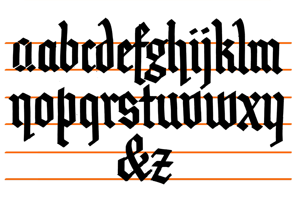 Meiner Meinung nach sind in gebrochenen Schriften die Klein- und Großbuchstaben gestalterisch sehr unterschiedlich (und die Zahlen erstmal!). Bei ’normaler‘ bzw. ungebrochener Schrift, gibt es das auch, wie ich schon hier gezeigt habe. Aber bei gebrochenen Buchstaben liegen da nochmal Welten dazwischen. Deshalb zeige ich dir heute zuerst gebrochene Kleinbuchstaben.
