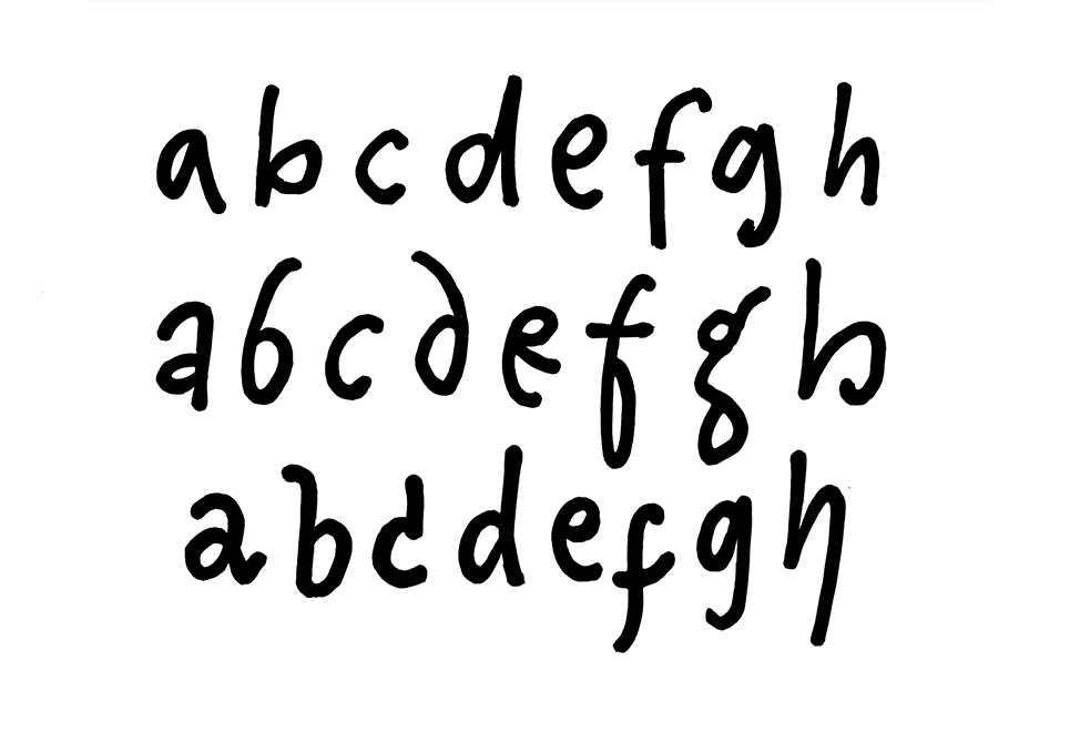 Als erstes solltest du dir kurz Zeit nehmen um zu überlegen wie deine Kleibbuchstaben an sich gestrickt sein sollen. Magst du sie eher klassisch, oder vielleicht verspielt? Dazu kannst du, mit einem Bleistift deine Buchstaben schreiben. Da geht es nicht um Perfektion. Mache nur ein paar lockere Skizzen der selben Buchstaben in Varianten, so wie ich.