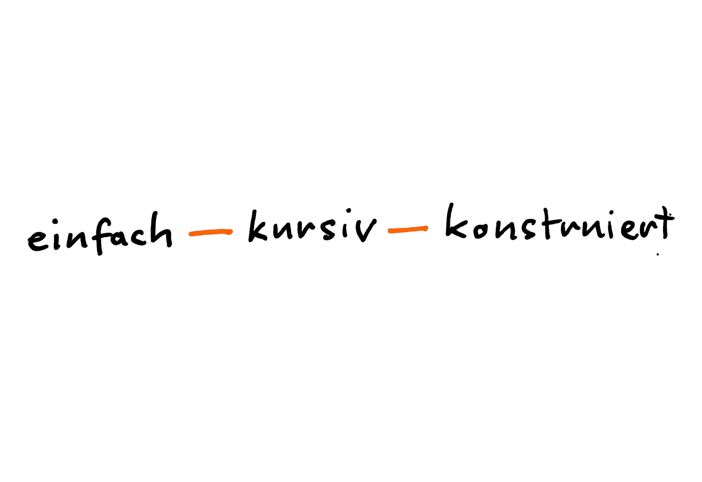 Sehr schön, jetzt gucken wir uns das bei kursiver Schrift und konstruierter Schrift an. Kursiv meint, dass die Buchstaben eine stärkere visuelle Anlehnung an die geschriebene Handschrift haben soll. Also mehr Schwünge und so weiter. Konstruiert hingegen meint, dass es Elemente der Buchstaben gibt, die man vielleicht umständlicher malen muss. Zum Beispiel mit Zirkel und Lineal. Du interpretierst hier diese Richtungen.